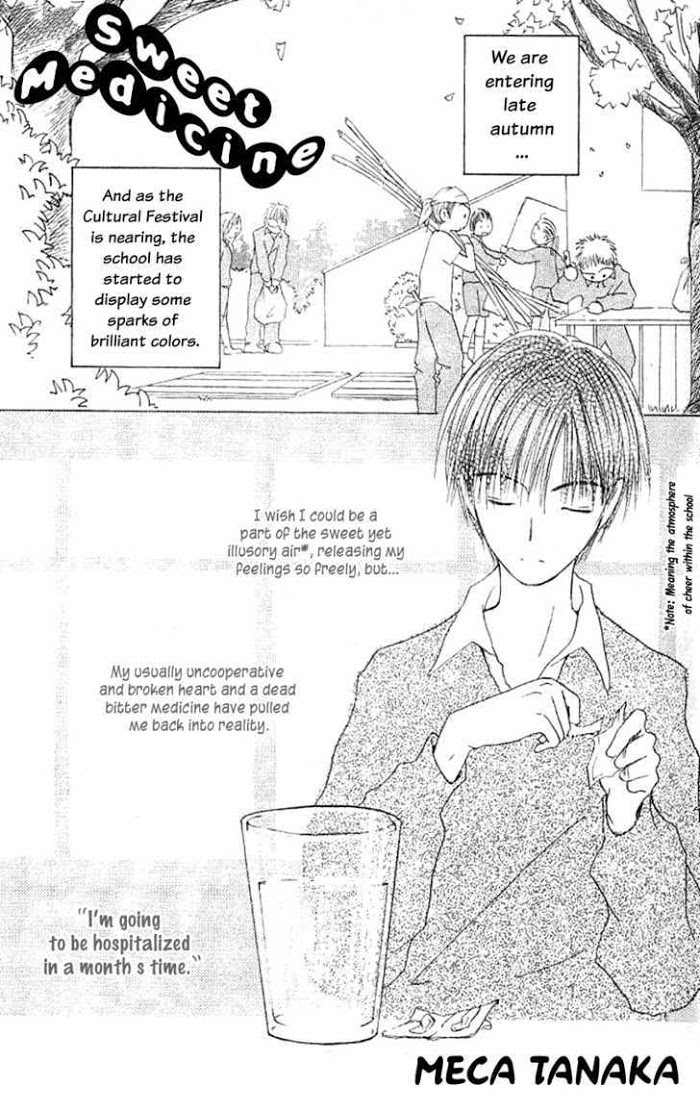 Sweet Medicine manga summary: Natsuo is suffering from a weak heart, and is mostly confined to the infirmary, the taste of bitter medicine in his mouth. Chiaki is a girl with horrible baking skills, yet dreams of becoming a baker whose cakes will be loved by everyone. Can this girl with bitter cakes sweeten a boy's bitter medicine?