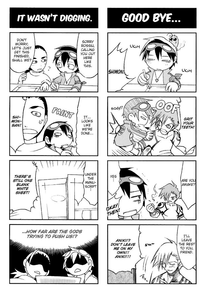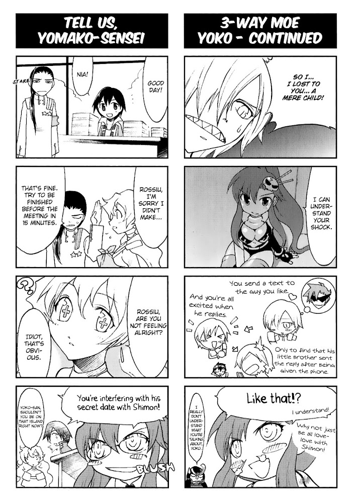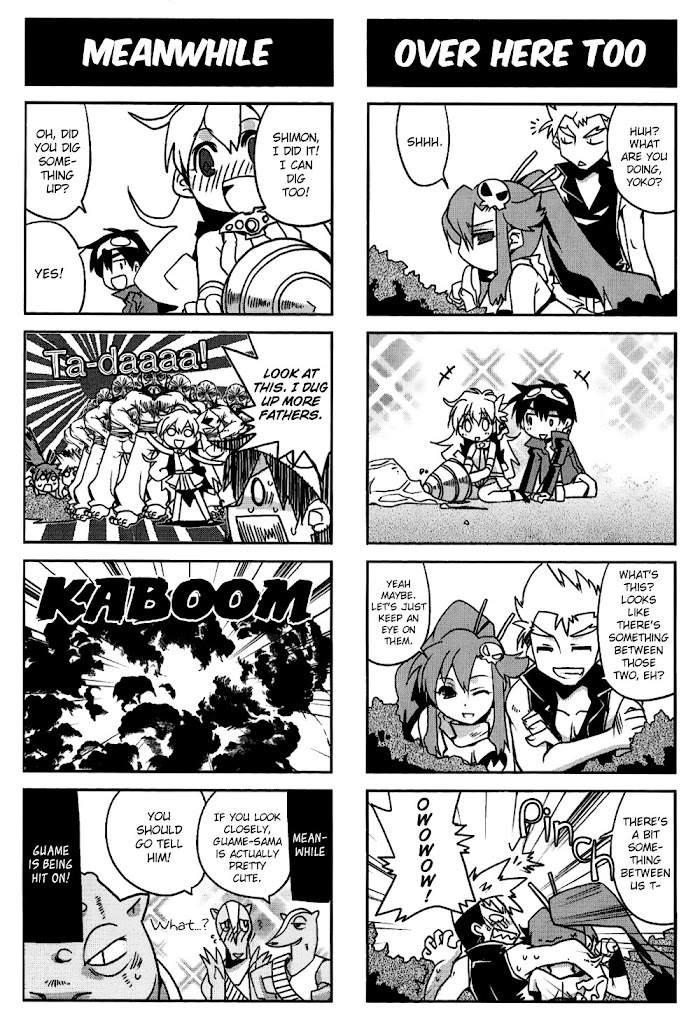 Tengen Toppa Gurren Lagann: Yoko no Obeso-hen manga summary: From AnimeCouncil²: The other OTHER version(s) of TTGL. The stories not told...perhaps...more like those you came up with after smoking a little too much... Twisted realities and perpendicular universes but above all they know who the hell we think they are. a 4koma manga