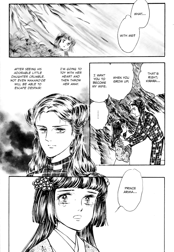 Description :Prince Naka-no-Ōe showed his interest in the talent and beauty of Nukata. He then offered Prince Ōama his daughter for marriage, in exchange for Nukata. Prince Ōama was in agony as he was devoted to his brother but in the mean time, he loved Nukata. In the end, he chose to let go of Nukata as a gesture of loyalty to his brother, however heartbroken. This was the beginning of the long and epic series of Tenjo no Niji, in which Princess Uno-Sarara, Prince Ōama's then young bride, would become his ally in succeeding the throne and later made herself Empress Jitō…..