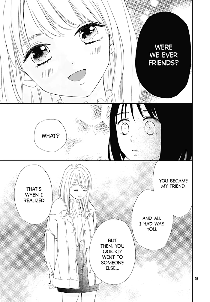 From Lovesick Alley: All Kako wants is to have the important people to her smiling. She treasures her two childhood friends so much, which is why she won't confess to Taisei about her feelings for him. One day, after Taisei's recovery from an accident, he then tells Kahoko that he and Uina have how started dating. She believes that their relationship is "unbreakable", or so she thought it was…