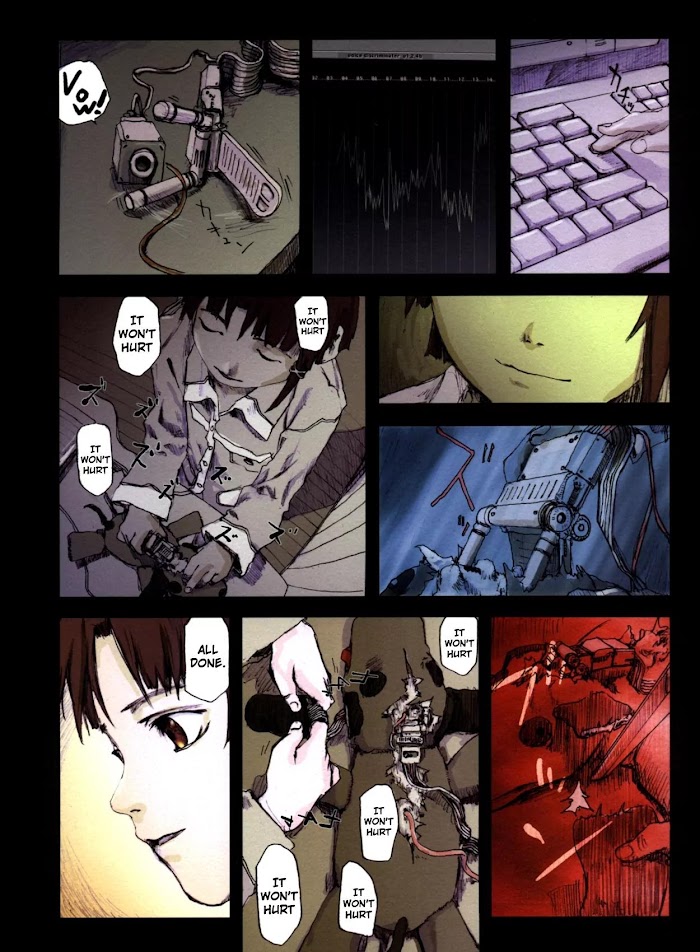The Nightmare of Fabrication manga summary: The Nightmare of Fabrication is a beautifully drawn full-colour manga from Yoshitoshi ABe. The 18 page short story can be found in the Lain Omnipresence in Wired artbook. It's a bonus story which apparently isn't related with neither the anime nor the PS game. It shows characters who were included in the PS game but not in the TV series (like the psychiatrist), but also determinant characters from the anime who didn't appear in the videogame (like Deus).