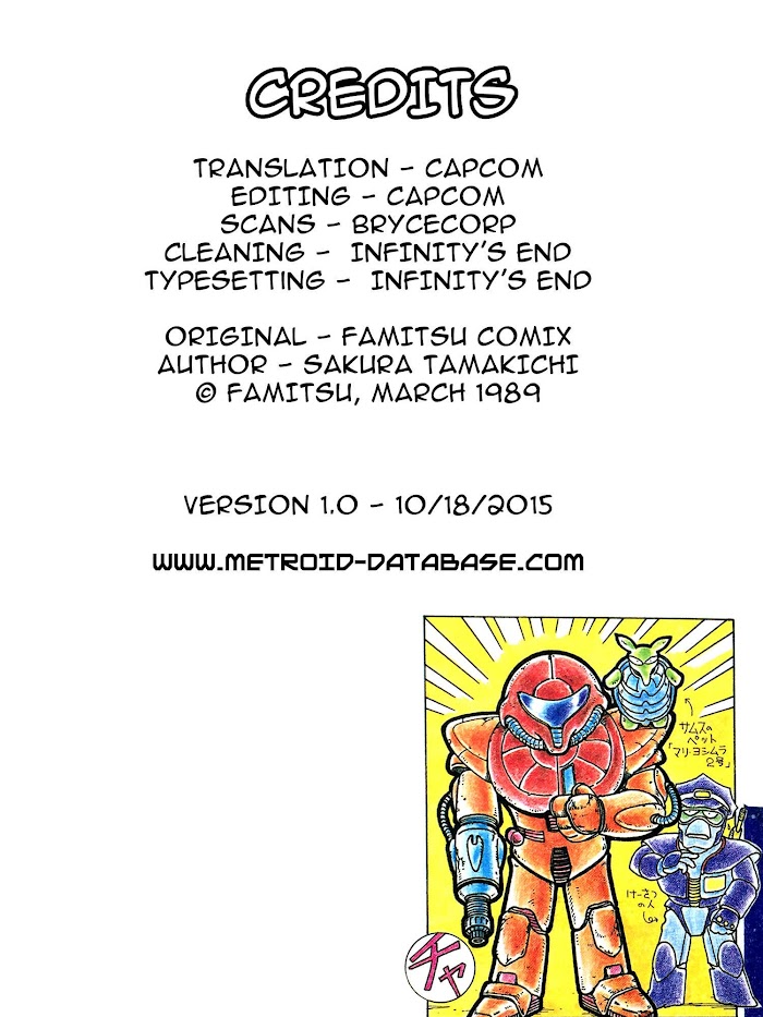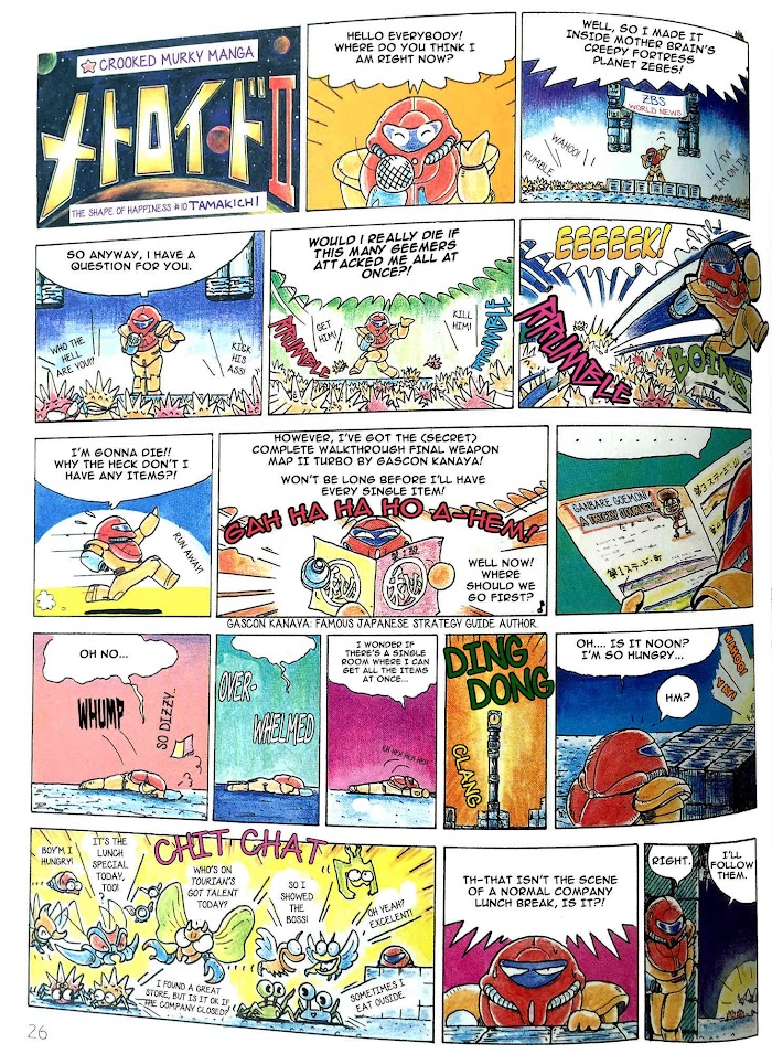 The Shape of Happiness manga summary: From: Metroid Database Back in 1986, Japanese weekly gaming magazine Famitsu featured a series of short comics based on popular videogame series. One of these was Metroid! Titled "The Shape of Happiness", the comics are part of a larger series featuring other games. They are drawn by Tamakichi Sakura, who is more famous for Super Mario Adventures in Nintendo Power. This six-page comic was collected and republished in 1989 as part of Famitsu Comix. There are plenty of fun little details in the pages of the manga - note the working titles for Zelda II and Kid Icarus on page 2!