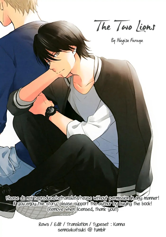The Two Lions manga summary: Junpei Shishido is a friendly guy who gets along well with anyone and everyone. One day, he meets a young man at university who acts aloof and distant towards him, and yet he looks familiar…?