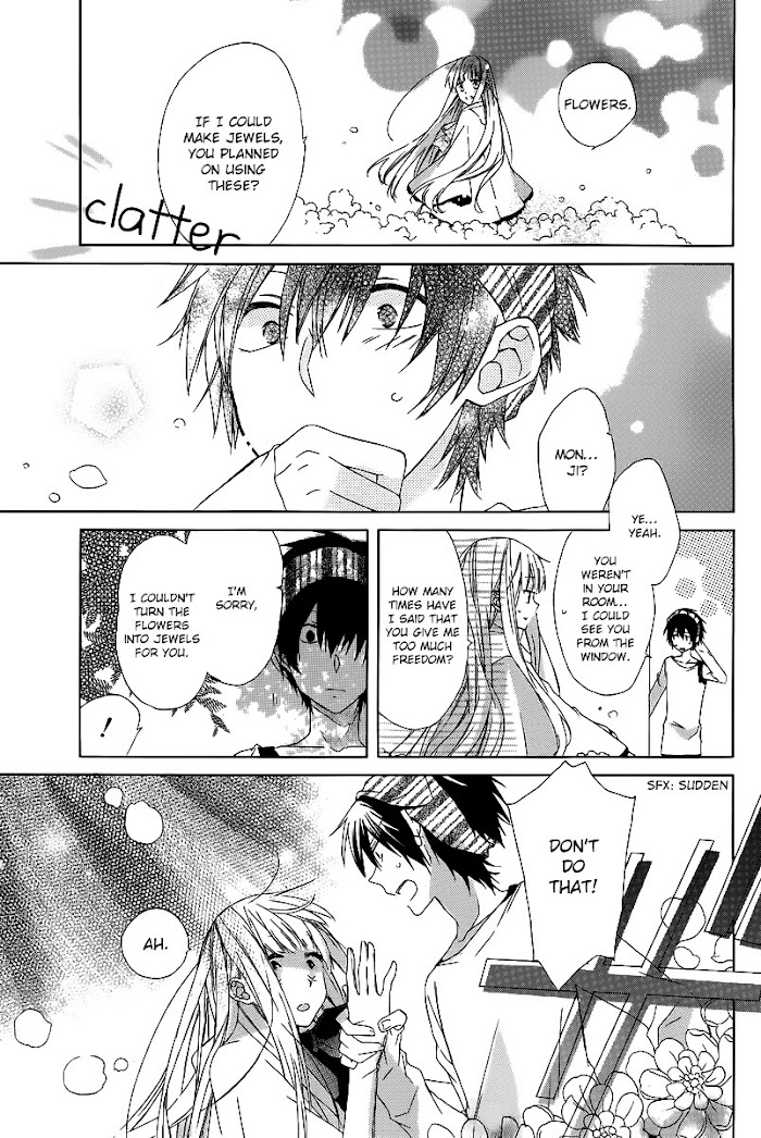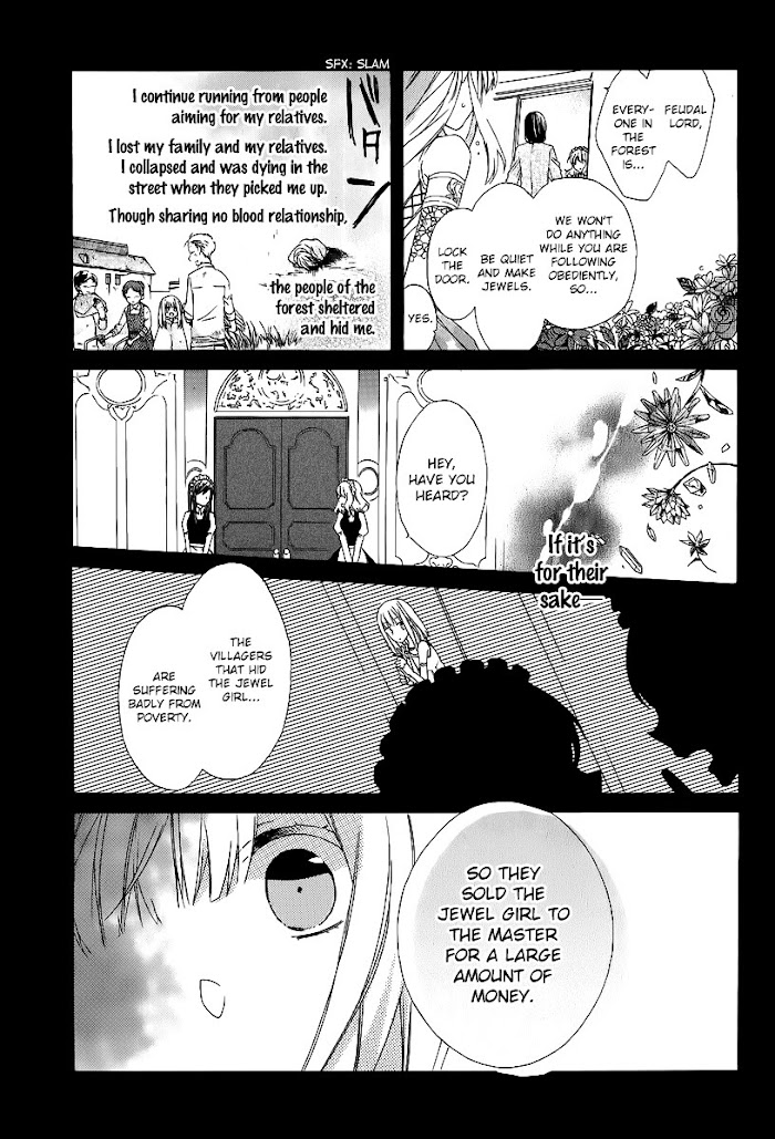 Azusa, known as the 'jewel girl' is one of the few remaining, living members of her family, that was gifted with a unique ability - according to her own emotions, she can turn flowers and plants into precious jewels. Held captive and working for one of the country's Lords for 10 years, the only thing she was looking forward to was catching a glimpse of the Lord's second son who was very kind to her. But now, that the boy has suddenly disappeared, her ability has started to diminish. Azusa runs away to find him, only to stumble upon Monji, a young thief who makes an interesting deal with her.