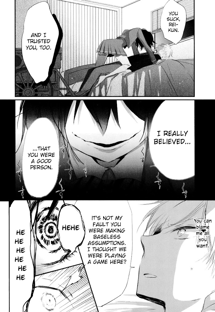 There's a new wheel-chair bound student at school who has returned after an illness, and she immediately kisses Tsuzuki Ui, who she calls "Rei-kun." He soon deduces that she is a daughter of a wealthy family, and a person he once beat at an internet murder mystery game. She is apparently fixated on him, since he was the only one who ever beat her, and she has now come to see him in person. Her plan is to have a real-life murder mystery game, and her current focus is on the supposed suicide of Tsuzuki's father. For some reason, she suspects his little sister Haruka... (Source: MangaHelpers)