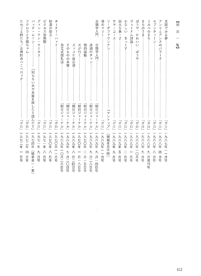 1. Tengoku de Miru Yume (A Dream in Heaven) 2. Henri to Anne no Ballad (The Ballad of Henri and Anne) 3. Seventeen 4. Umibe no Machi (Seaside Town) 5. Machi no Uma (The Town Horse) 6. Bouya, Kawaii Bouya (Little Boy, Cute Little Boy) 7. Vietnam Touron (The Vietnam Debate) 8. Kanashii Max (Sad Max) 9. Kyodai na Zou II 10. Summer Course 11. Soda Fountain 12. Minato no Marie (Harbour Marie) 13. Bunruigaku Nyuumon 14. Chee-Chee Hat 15. Keikigeki: Sabaku no Medama (A Light Comedy: Eyeball of the Desert) 16. Pickles-gai Ibun (Strange Tales of Pickles Street) 17. Ding Dong Circus 18. Bad Moon (The Bad Moon) 19. Fukurou to Koneko-chan 20. Tawagoto-shi-tachi Kotenteki Abekobe Lock 21. 6-gatsu no Inseki 22-23. J.J. Picard Shi no Hanashi no Tsuzuki 24. Boku no Debuinko-chan 25. Scat Taisa no Kiroku 26. Shoukasen Otoko 27. Tabi no Tenshi 28. Dokusho no Tashinami 29. Dr. Aesop 30. Doutoku Manga 31. Muteki no Zokubutsu 32. Sorezore no Asa 33. Suna ni Kieta Tamida 34. No Kid No Cry 35. Make a Fake 36. Hijou no Okite 37. Half Crazy