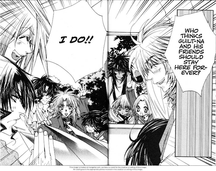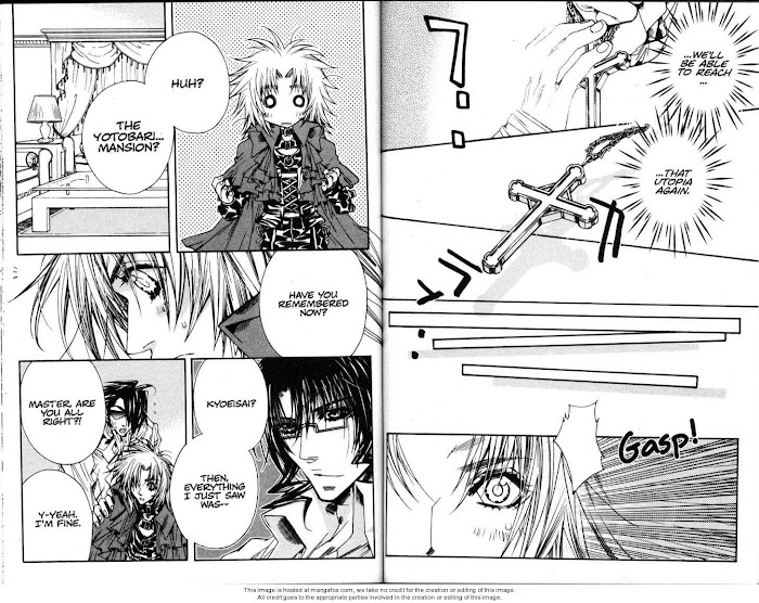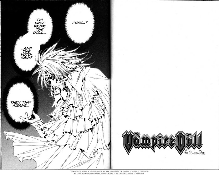Vampire Doll manga summary: Guilt-Na-Zan is a vampire aristocrat who was sealed into a cross by Kyouji's ancestor more than 100 years ago. Now Kyouji has revived him--although his soul was resurrected into a cute female doll and can only transform into his real figure when he sucks blood from Kyouji's sister Tonae... But when you combine Goth clothes and hot vampires, slowly but surely everyone will start to feel like one big family! -- Tokyopop