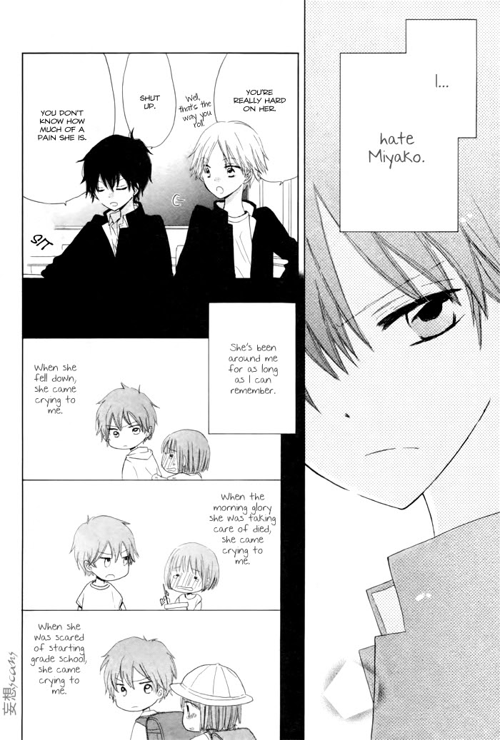 Tomo has always been stuck with the dependent Miyako ever since she was born. For half of his life, he had been forced to look out for her due to her clumsiness and unreliability. Simply put, he 'hates' her. But there is something that completely prevents him from telling her his real feelings. When she is about to move to the United States, will he be able to love and let go, all before it's too late? A lovely, touching story about a boy and the one most important to him. (Source: M-U)