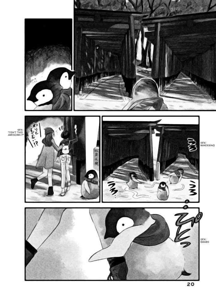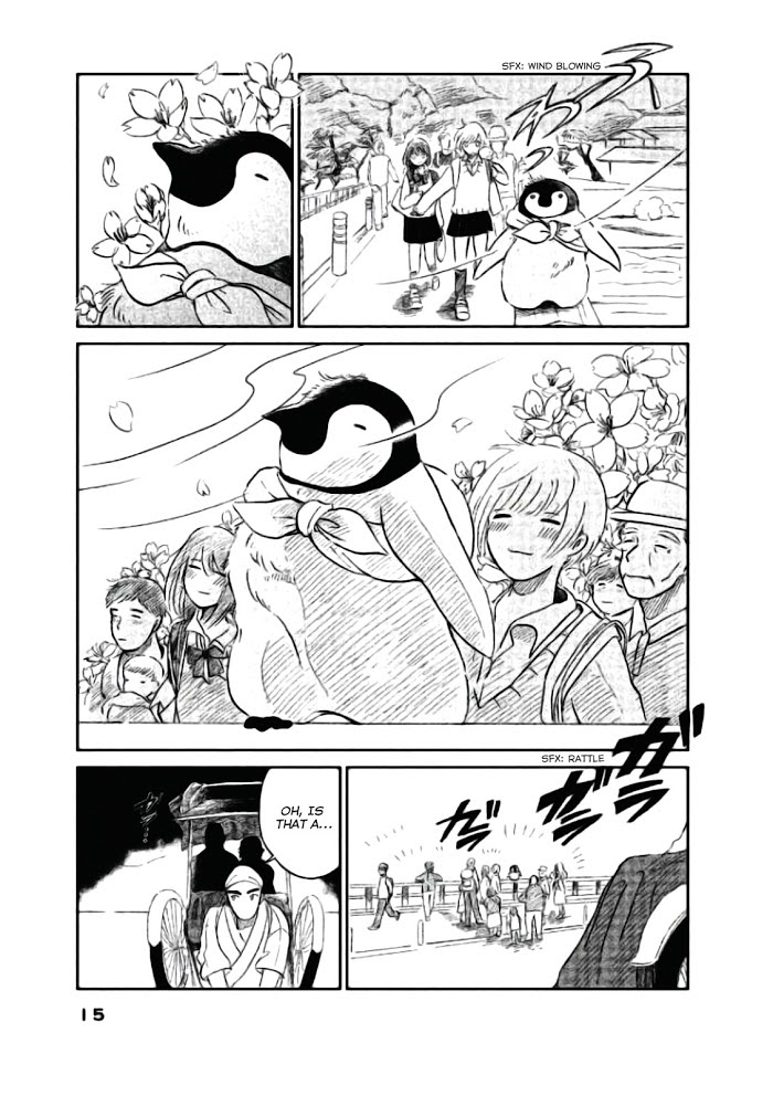 Welcome, Chitose-chan manga summary: There's a penguin living in Kyoto named Chitose-chan. This fluffy and adorable penguin loves to eat and have fun. She's friendly with humans and allows them to feed her. She travels around Kyoto, letting her curiosity be her guide. This manga features famous parts of Kyoto such as Kiyomizudera, Ginkakuji, and Gion as seen from the eyes of a penguin.