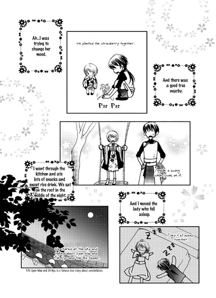 Yeonliji manga summary: The world which was ruled by those called the descendents of god and had unique abilities: Heuk's (Black) clan and Sahwa's clans. One day, Heuk's clan was destroyed by one of the average human clans, the Parang (Blue) clan. The Sahwa clan sends their heir, Gayeon, as bride to the Parang clan's heir as a sign of obedience. But the one who's actually sent is the the heir's twin brother, Jayeon. Now, Jayeon lives amongst the Parang clan....